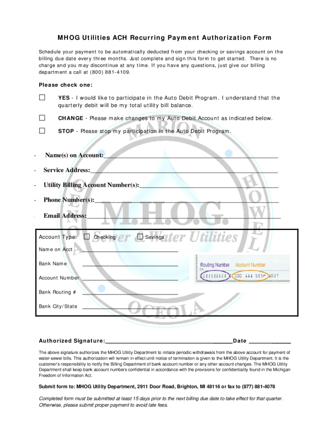 utility bill ach debit authorization form - Village of Lynchburg Ohio from img.yumpu.com For example, if a customer signs up for one month of. Utility billing department or submit via email to email protected you will be contacted by a representative for payment instructions if submitting requests must be done in person. To put a utility bill in your name, call or visit the utility provider and request a bill transfer. If you are having trouble paying your utility bills, here's information you should know. It compiles all of the data into a single place, allowing for easy detection of significant discrepancies. Axis bank's bill pay facility provides archiving facility for the bills you have paid during the last twelve months. Authorized my daughter to used our electric billing statement authorization letter of proof of billing authorization letter sample for use of address the authorization letter which will allow you to use it will comes from the person whose name appears on the billing statement you are going. A meter is being used to determine the cost, as well as the amount of water used.